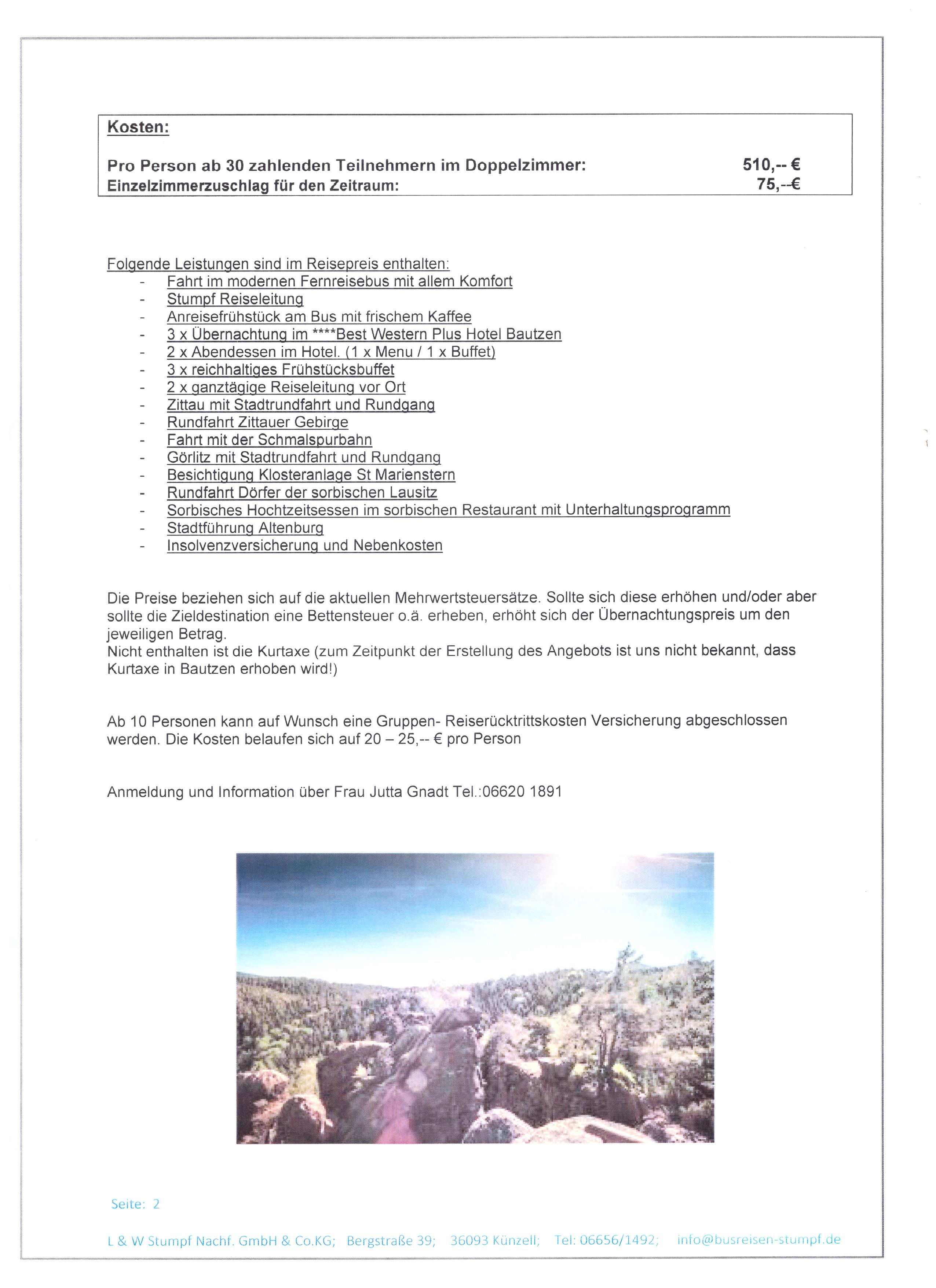 Dieses Jahr fahren wir nach Bautzen und ins Lausitzer Bergland. Übernachten werden wir in Bautzen im Hotel mit Halbpension. Geplant sind Besichtigungen in Bautzen, Zittau und Görlitz sowie eine Fahrt mit der Schmalpurbahn nach Oybin.